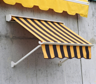 Toldo cuyos brazos se extienden en un plano horizontal Está realizado íntegramente en aluminio y tiene un sistema interno de tensión mediante resortes y cable construidos en acero inoxidable.